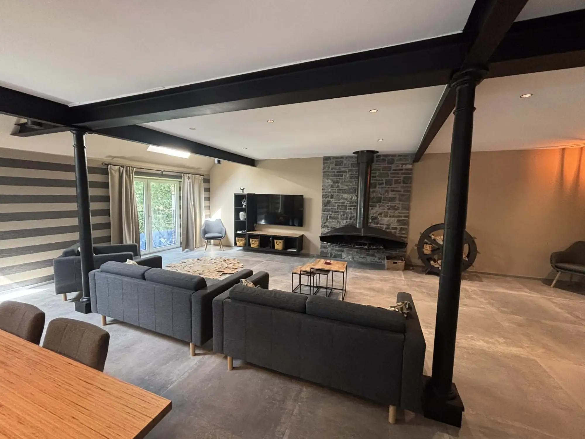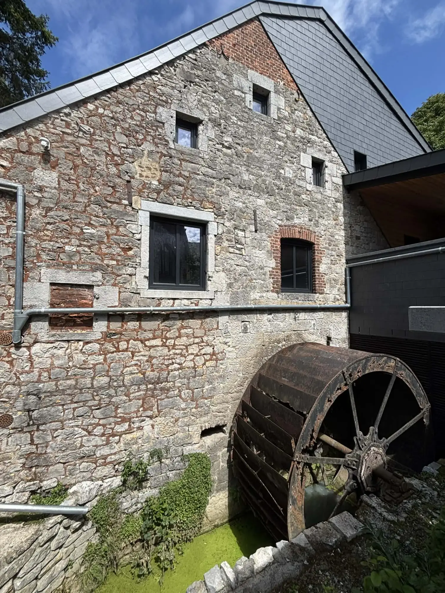 The cottage “Au moulin endormi” is a welcoming and friendly place, to be discovered with family or friends, for authentic moments of sharing and relaxation. At the end of a small peaceful hamlet, where the road ends to make way for fields, hides a unique place. Former flour mill in Olne, our cottage has retained its stone soul and its majestic water wheel, which you can admire from your living room. Located in the heart of the Province of Liège, this cottage for 9 people is the ideal place to enjoy the many activities organized throughout the year (Spa-Francorchamps Circuit, Blegny-Mine, Val-Dieu Abbey, Liège/Bastogne/Liège, Francofolies de Spa, les Ardentes, Olne/Spa/Olne, etc.). Whether you are a cyclist, walker, jogger, you will discover a rich nature, conducive to recharge your batteries. Shopping and sightseeing enthusiasts, the village of Olne is a central point located between Liège, Maastricht and Aachen. Enjoy a spacious and warm living room. Whether it’s an evening by the wood fire, a family board game tournament, or a movie night with Netflix, everything is designed for your relaxation. Our super-equipped kitchen and air-conditioned rooms guarantee you a stay without any logistical worries. Long before being a refuge for your holidays, our cottage was the beating heart of the hamlet. Former water mill, its walls once resonated with the creaking of the millstones transforming the grain from neighboring farms into fine golden flour. If the sacks of wheat have given way to modern comfort, the spirit of the place remains. From the living room, through the window, you can admire this impressive mechanism that seems to be “sleeping” peacefully today. Staying with us means immersing yourself in the soul of a preserved region. Olne is not just a village, it’s a postcard setting.