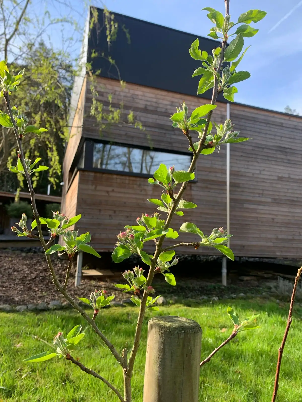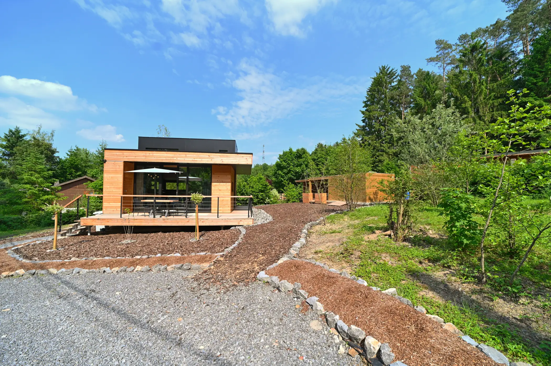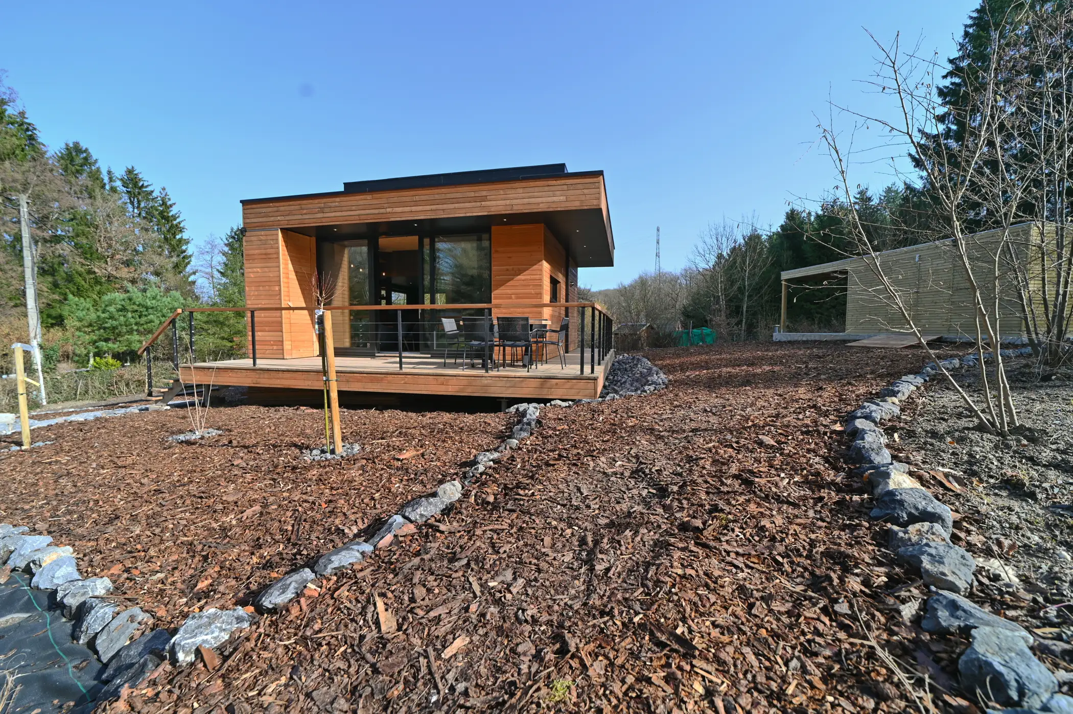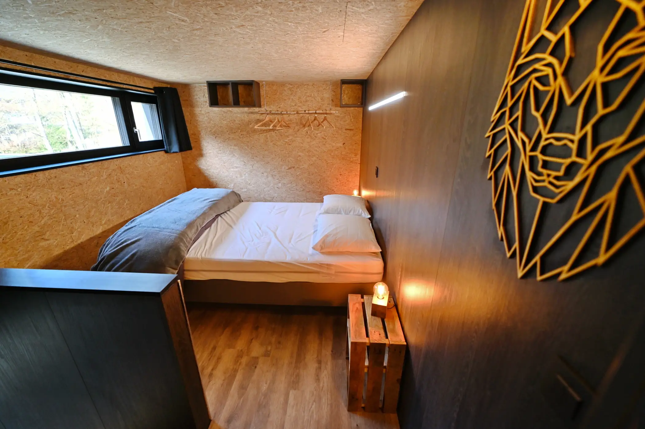 WILDCUBE is an ECO-friendly vacation rental designed with respect for nature. Ideally located, quiet, close to Durbuy, perfect for recharging. Ideal for a romantic weekend or with children. Almost zero energy. The living room with large windows is oriented towards nature. The great modularity of the living space gives a very pleasant feeling, with a fully equipped kitchen (dishwasher, ceramic hob, combi-oven, …). The dining room is equipped with a sliding table, which can be used as a dining room for 6 people, or as a lounge area for an aperitif or a comfortable TV evening. The lounge area is part of this space and is ideal for relaxing or reading a book. In the evening, close the curtains and enjoy a super comfortable king-size bed. The bathroom is equipped with a shower, sink and toilet. Upstairs there is a bedroom for 2 people and a bedroom with bunk beds for children. The large terrace with sliding window is partly covered, allowing you to enjoy it even in the low season. The house is almost passive with straw insulation, a heat pump and heat recovery ventilation. WILD CUBE can be combined with WILD NEST for 2 people located on the same street (tiny house). Free WIFI. No pets allowed. Outdoor lounge with wood-fired Nordic bath!! Barbecue, brazier, sun loungers, everything is provided for pleasant moments! Secure garden shed for bicycles (with accessories and charging only for bicycles). Member of Geopark Partner, and Ardenne Ecotourism, and also Welcome bike. Non-smoking accommodation, not suitable for parties and night noise. Sports/cultural activities nearby, Durbuy and its Christmas market, Wéris and its dolmens… A breakfast can be booked directly after booking.