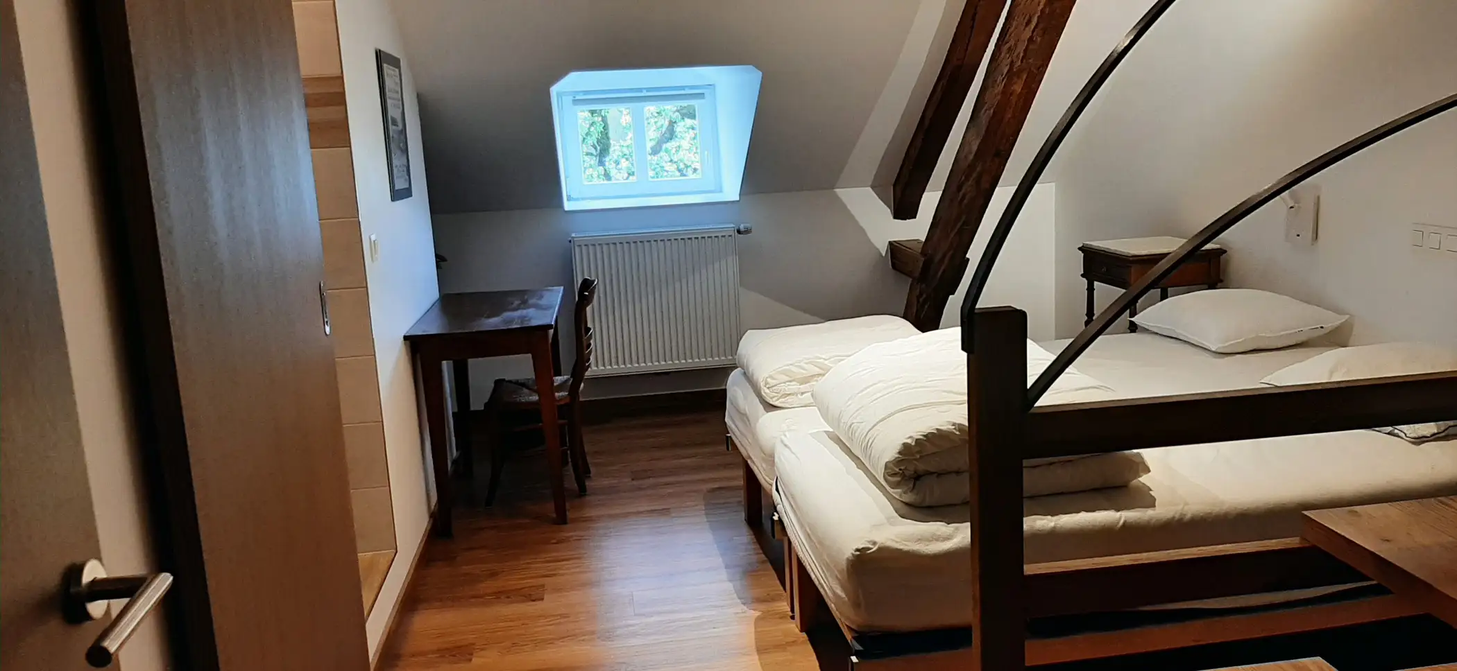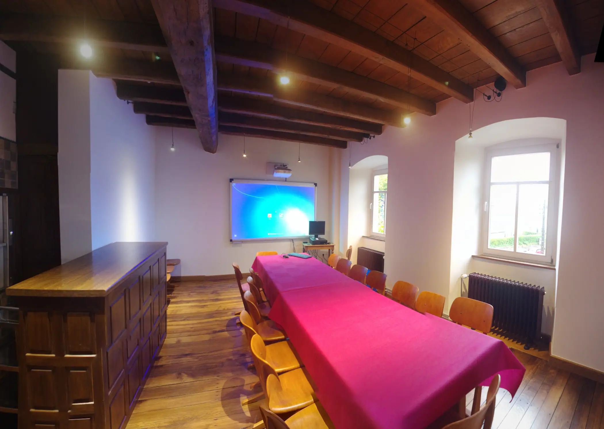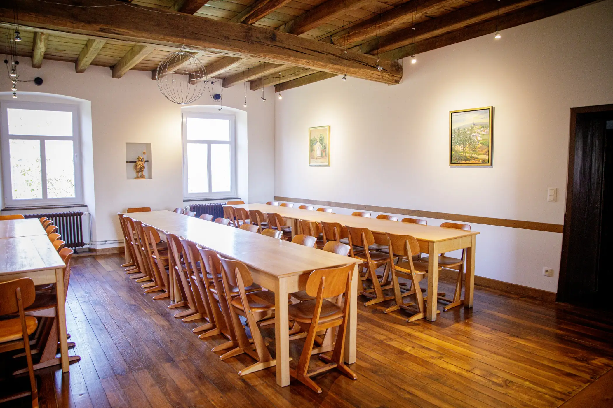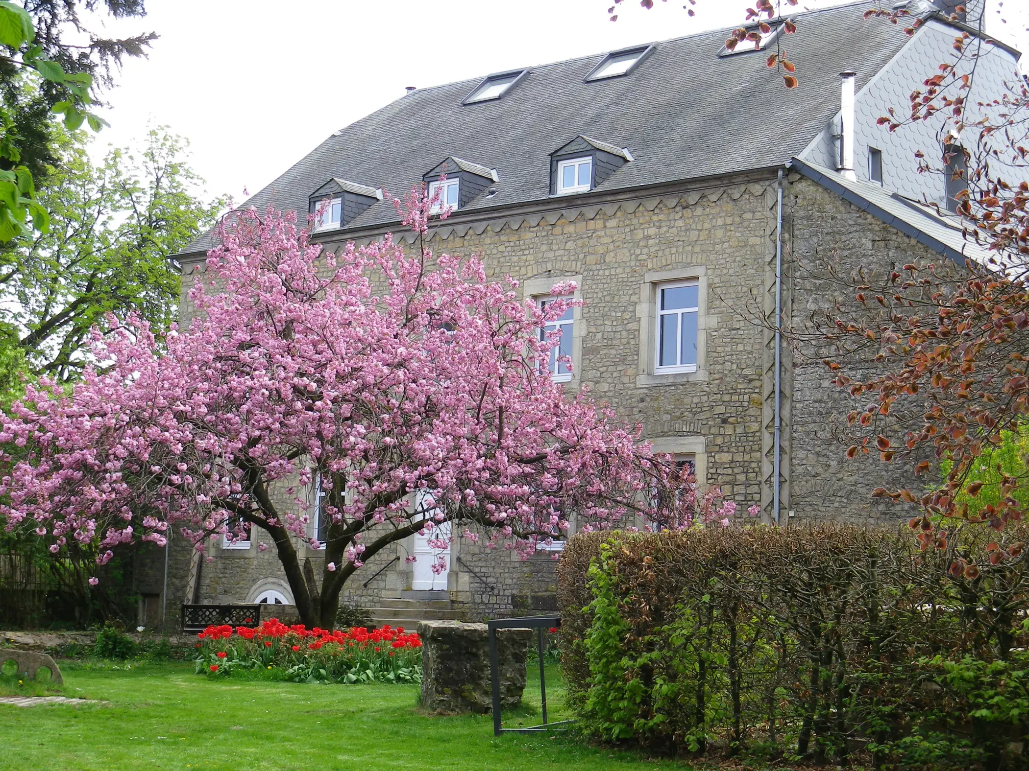 The Cottage has: – on the ground floor, a large equipped kitchen, a dumbwaiter, a 29m² dining room, a 35m² living room with wood stove and piano, a room for people with reduced mobility, and sanitary facilities – on the first floor, a large dining room for 75 people with screen + projector and piano, a meeting room of 26m² with screen and projector, 3 bedrooms and 2 bathrooms; – on the second floor, 5 bedrooms and 5 bathrooms – in the basement, two vaulted cellars converted into a relaxation area with bar, pool table, ping pong table, and two foosball tables – outside two internal courtyards, one with parking, a park, and a garden with shelter and plancha-brazier. Our “pausade”, located in the quiet of a small village in the Natural Park of the Attert Valley, in the Natura 2000 zone and 25 km from Luxembourg, is ideal for your meetings, receptions, and family gatherings. Different rental options can be offered to you, depending on the number of people you wish to accommodate. Central heating is installed on all 4 levels and our ground floor has facilities for people with reduced mobility.