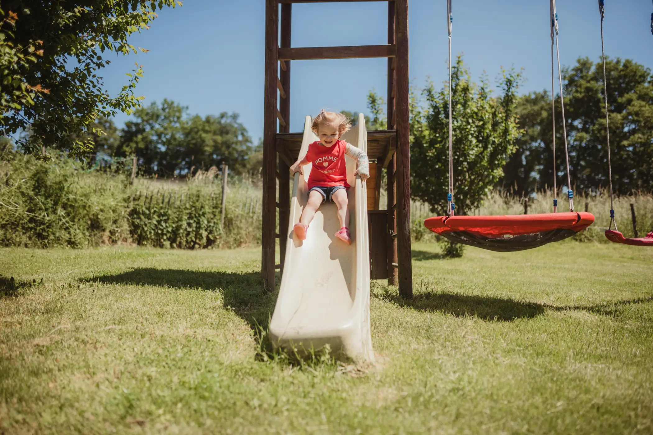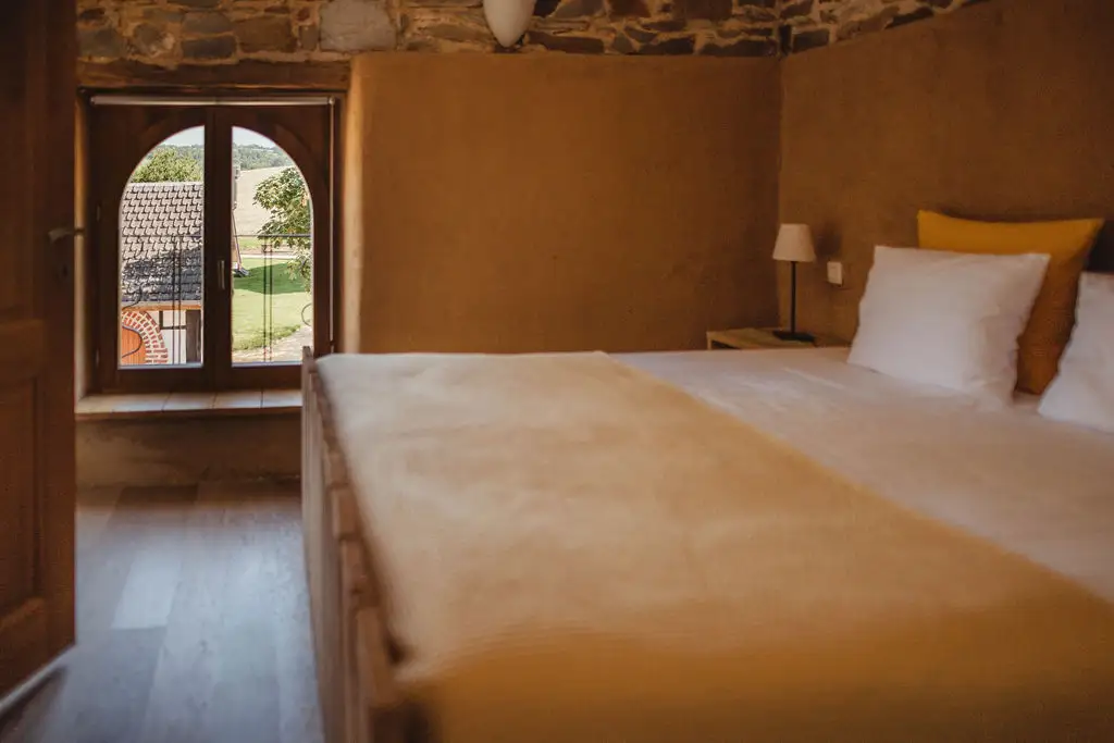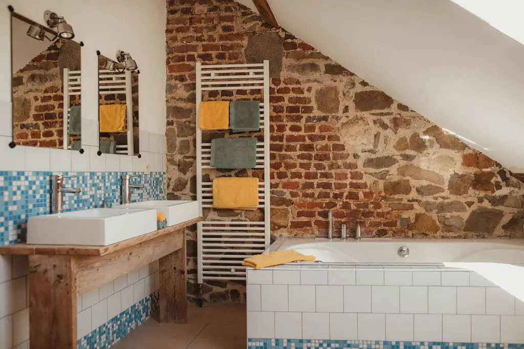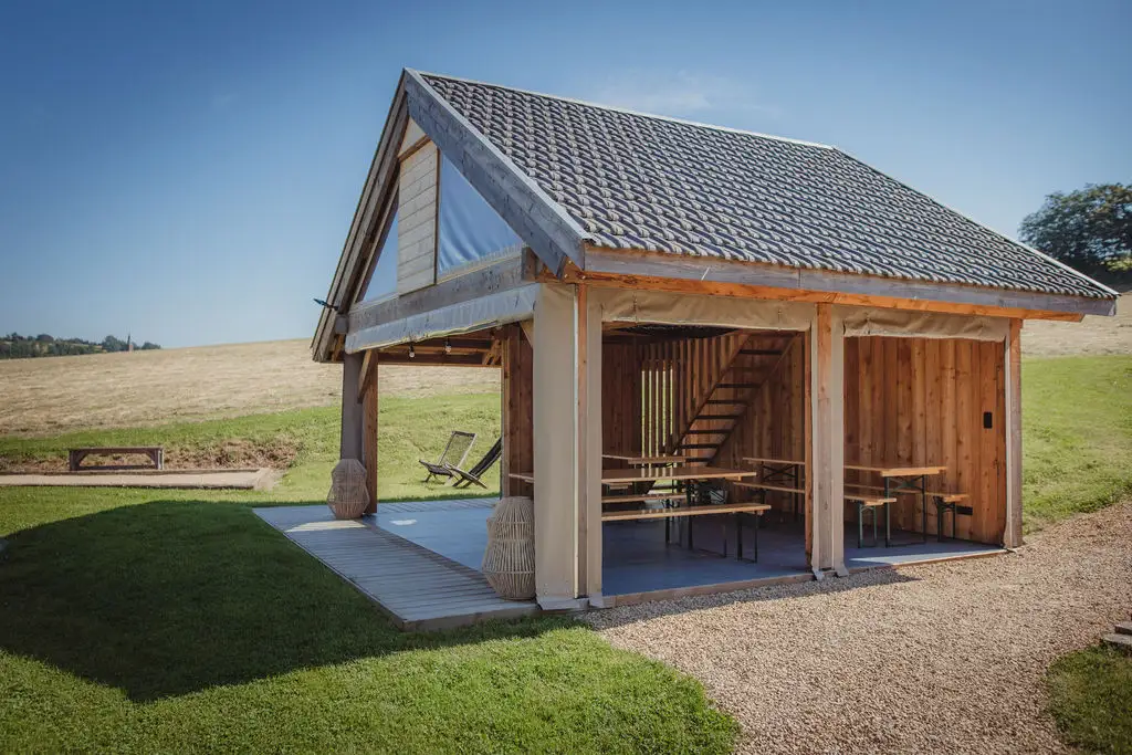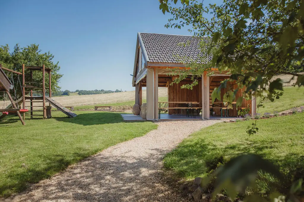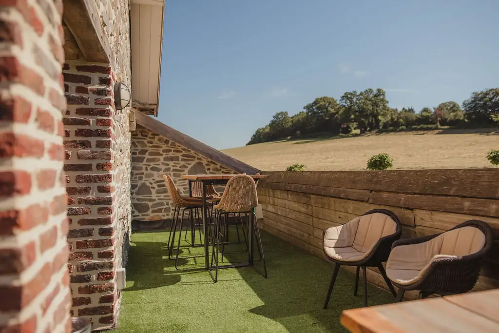 The establishment consists of two large capacity cottages arranged in a former stone farmhouse typical of the region. Surrounded by meadows and enjoying an exceptional view of the countryside, La Bushaye is the ideal place to relax in peace while being close to various points of interest and amenities. Le Grenier is a cottage for 14 people located on the 1st and 2nd floor of the building. It consists of 6 bedrooms (5x2p + 1x4p) and 5 bathrooms. Its large living room with open kitchen gives access to a terrace where you can have an aperitif and meal while enjoying an exceptional view of the countryside. Outside, the courtyard and the common playground will delight both children and adults.