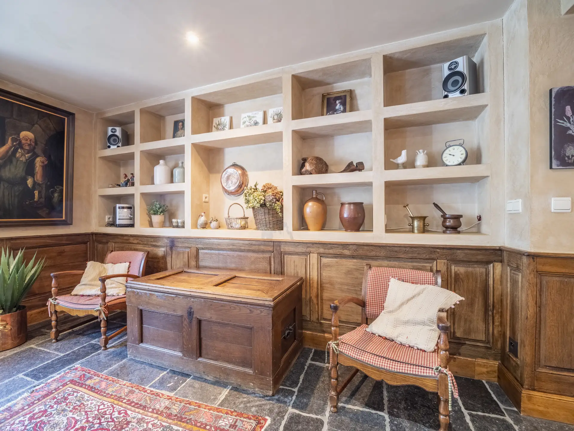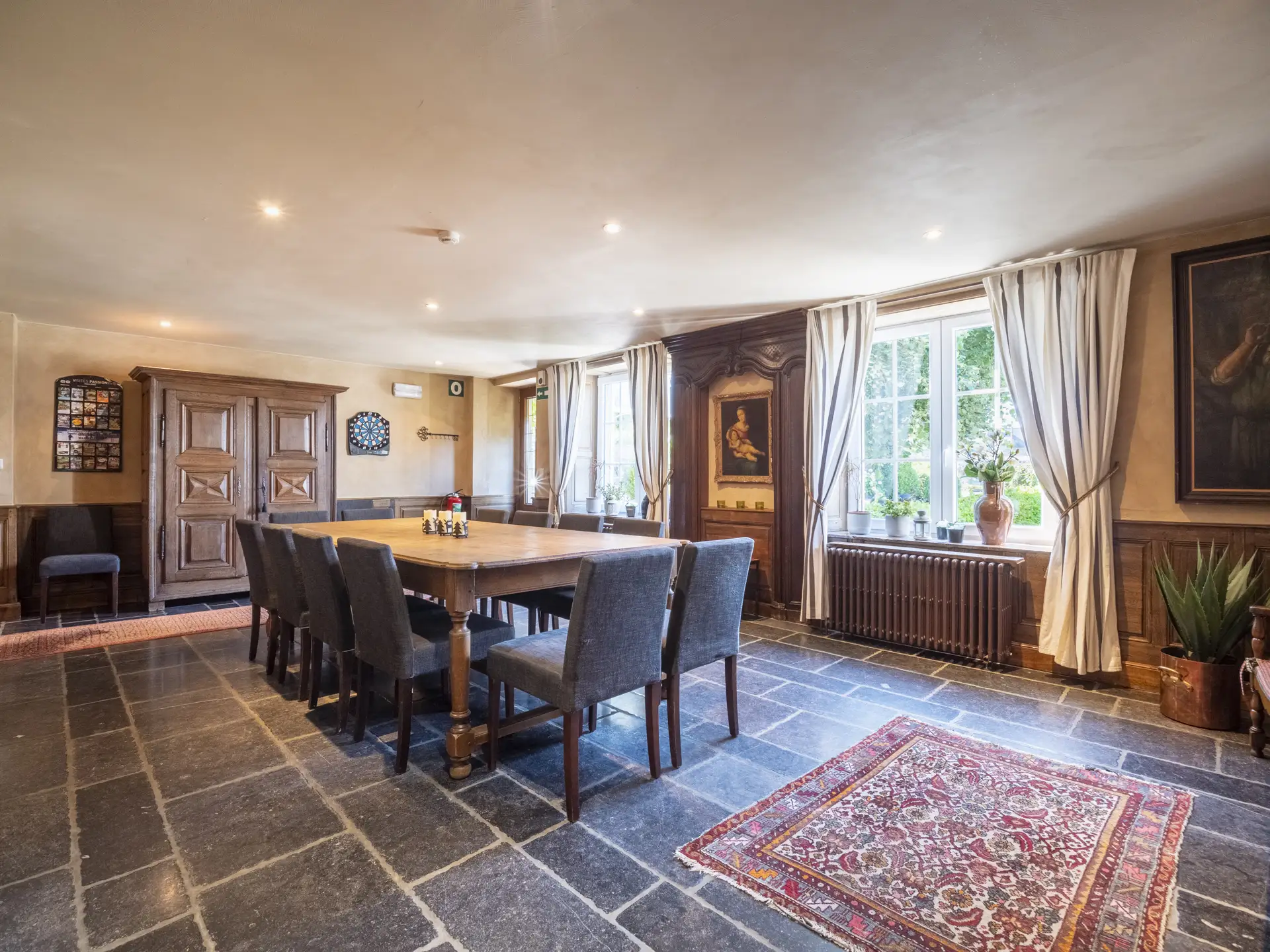 • Living room with 2 sofas, armchairs and ottoman, 14 seats, large screen TV, double-sided wood cassette.