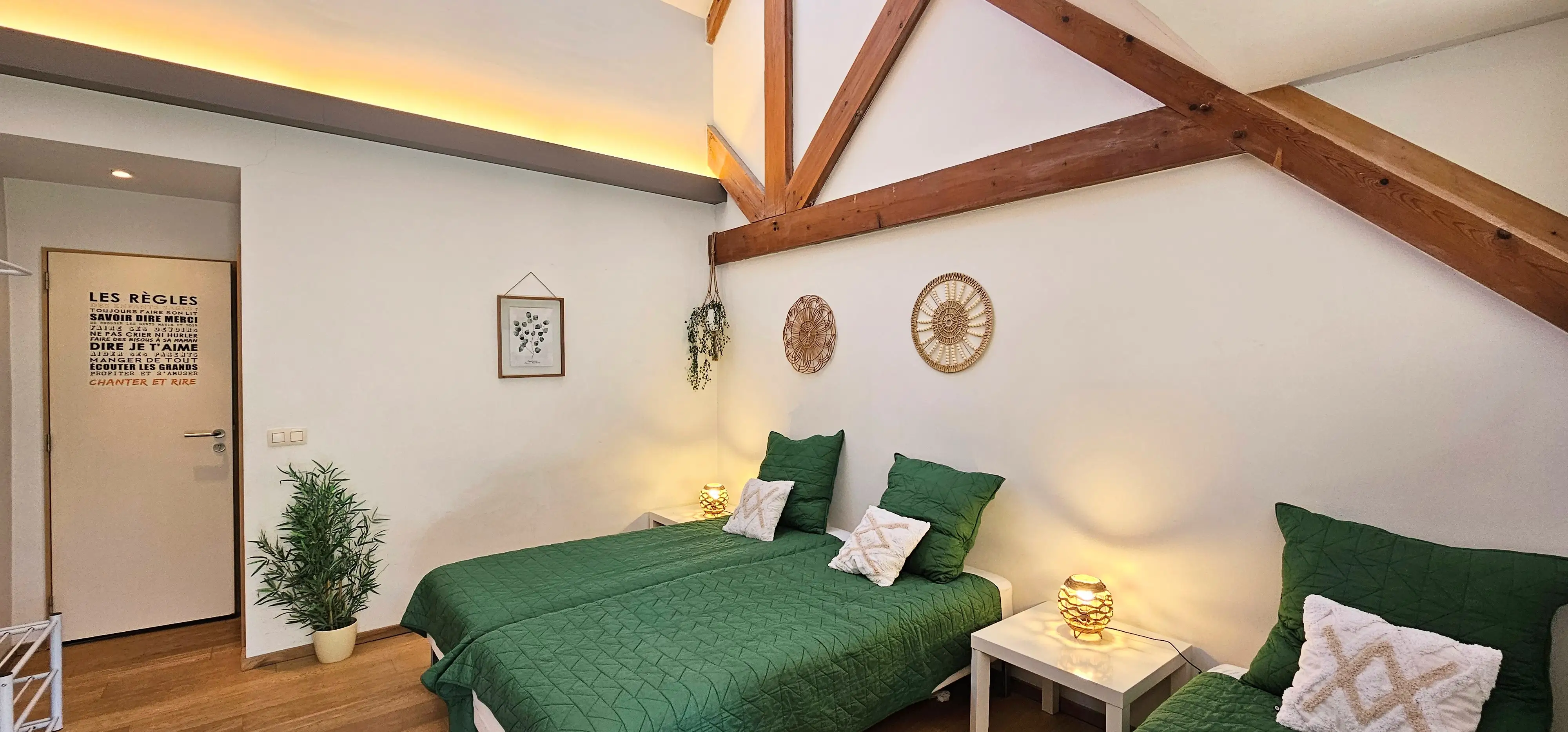Cette ancienne ferme en carré est située dans un village typique du Condroz namurois, le long de la route du fromage, à quelques kilomètres de Maffe et de Durbuy. La région est magnifique et les activités ne manquent pas à proximité: golf, golf fermier, karting, bowling, VTT… ainsi que découverte de producteurs et d’artisans locaux. Le gîte est spacieux et confortable. Les chambres sont bien isolées de la pièce de vie ce qui permet aux plus tardifs de ne déranger personne. Les jeunes enfants s’amuseront dans la zone de jeux sécurisée spécialement aménagée tandis que les ados trouveront leur place près du baby foot, du billard, de la table de pingpong ou dans le petit salon. De nombreuses promenades balisées partent du gîte traversent les bois et longent de très belles propriétés. Possibilité de louer en plus des salles de différentes styles et capacité (de 40 à 180 m²) pour y organiser fêtes, réunions et séminaires en tout genre. Sur simple demande un de nos traiteurs se fera un plaisir de vous livrer ou de vous préparer un repas sur place.