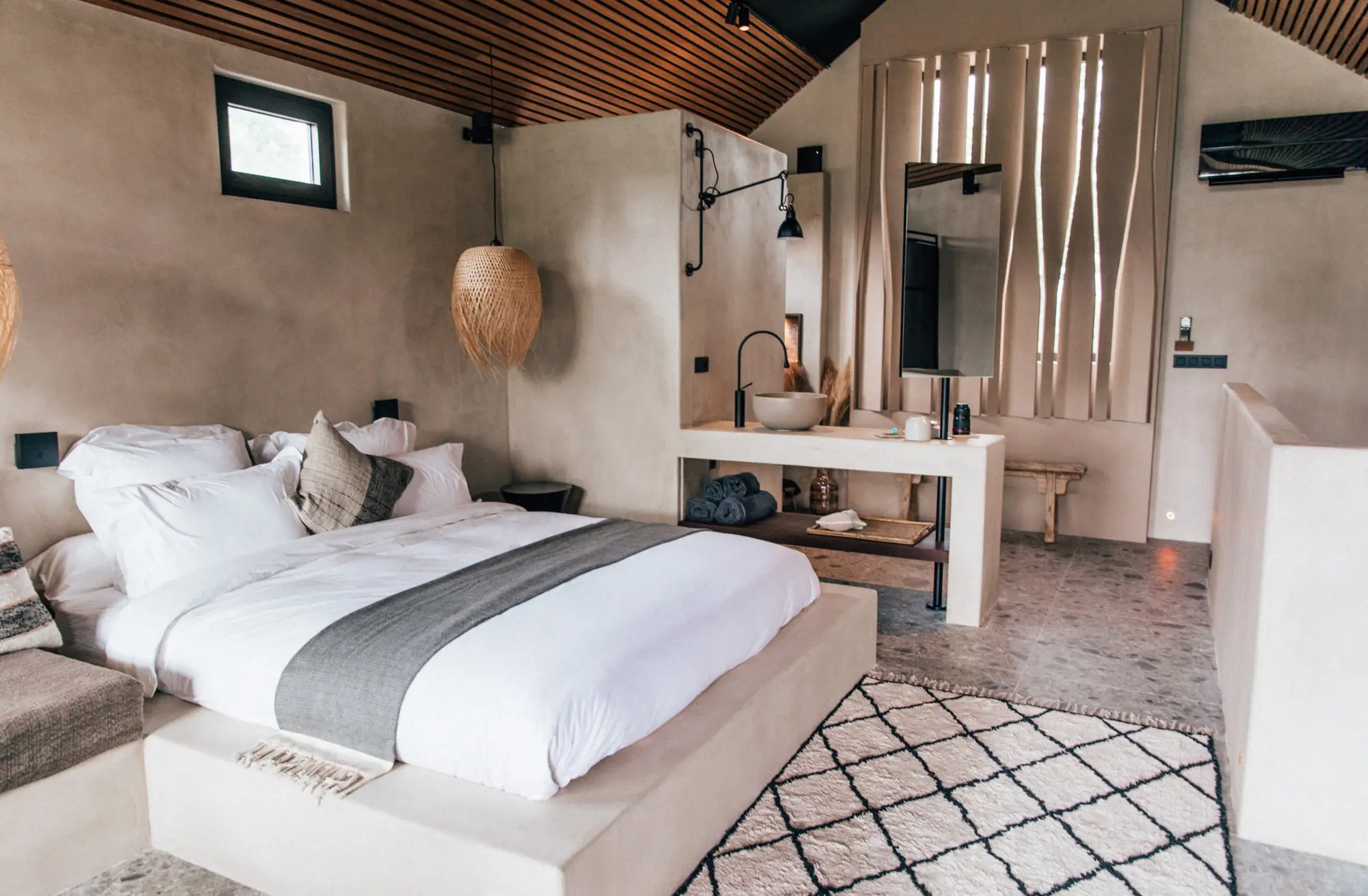 De stijl van de inrichting zit vol reis- en avontuurinspiraties … Het combineert minimalistisch modernistisch, high-end ruw en duurzaam design met een mix van mediterrane, bohemien-chique stijlen, met Balinese invloeden …