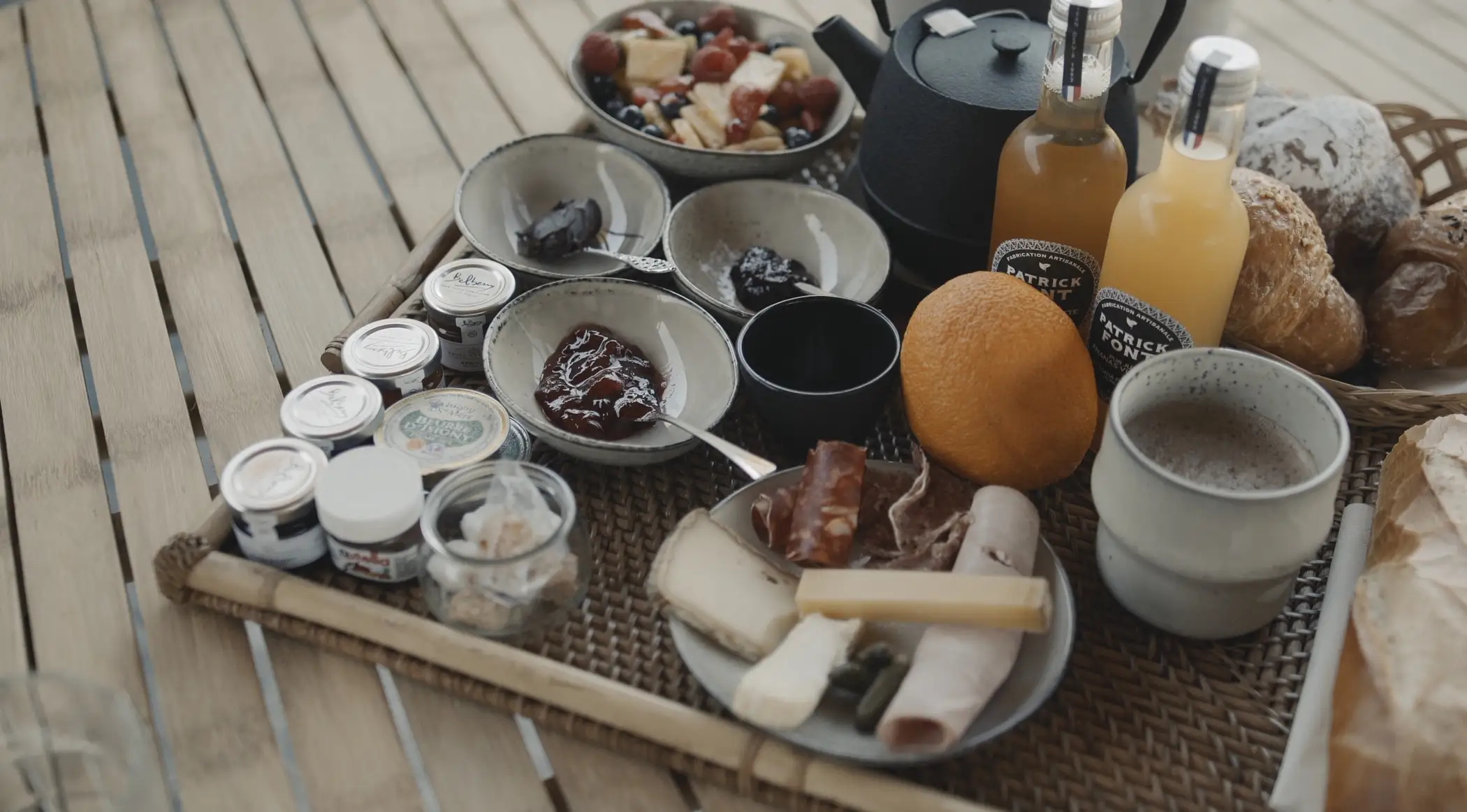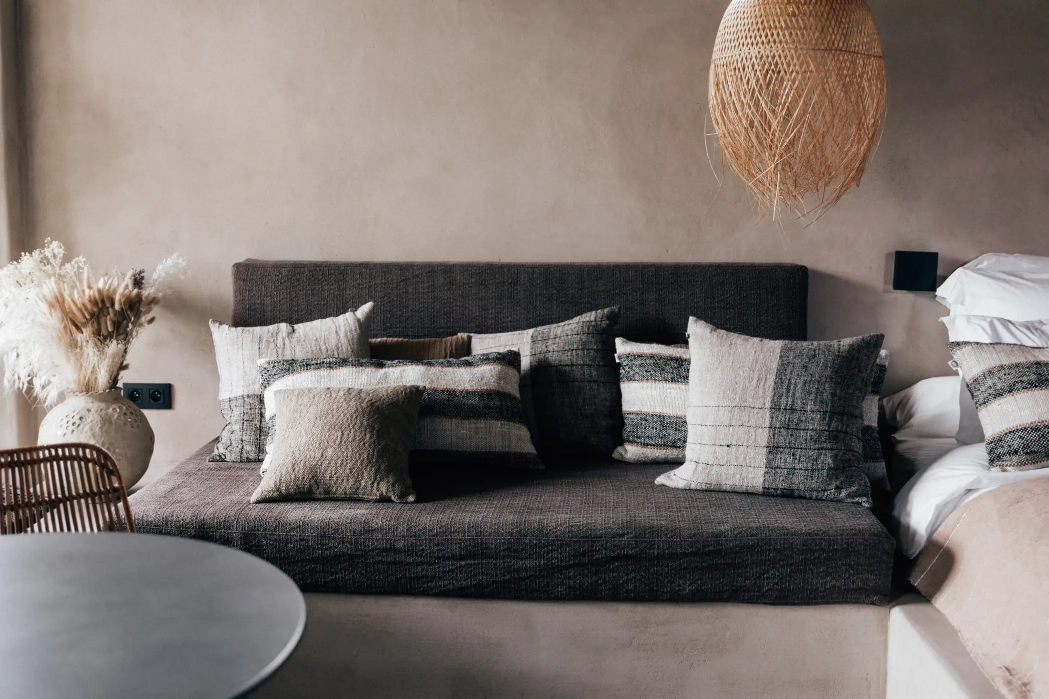 Het kleurenpalet is warm, variërend van ecru tot antracietgrijs. De gebruikte materialen zijn traditioneel zoals hout, kalk, steen, plantaardige vezels en ijzer voor een natuurlijke, comfortabele en verfijnde decoratie.