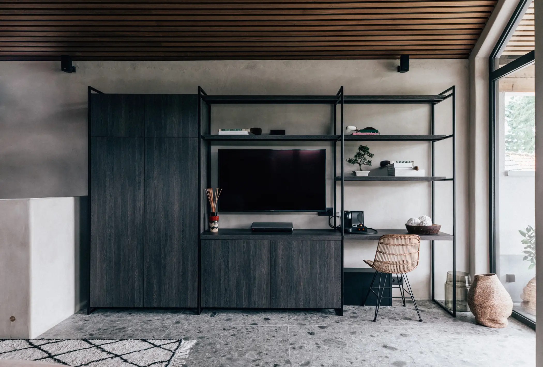 We wilden een ideale en vredige oase creëren om los te komen van de realiteit. Het interieur is volledig ontworpen om jezelf onder te dompelen in een nomadisch en warm universum. Het is de dualiteit tussen reizen en terugkeren naar het land die het project authentiek maakt.