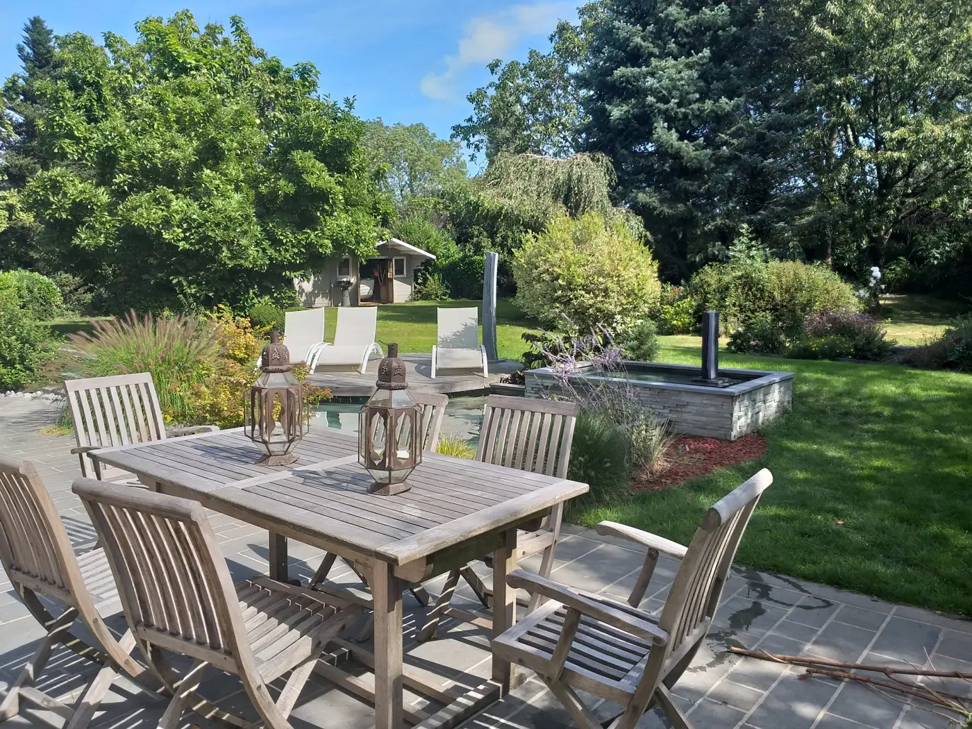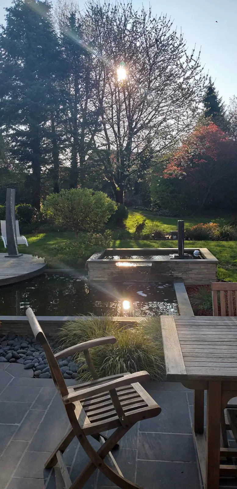 U ontbijt in de grote woonkamer die uitkomt op de met bomen omzoomde tuin en de grote vijver. Exclusieve toegang voor onze gasten tijdens hun verblijf.