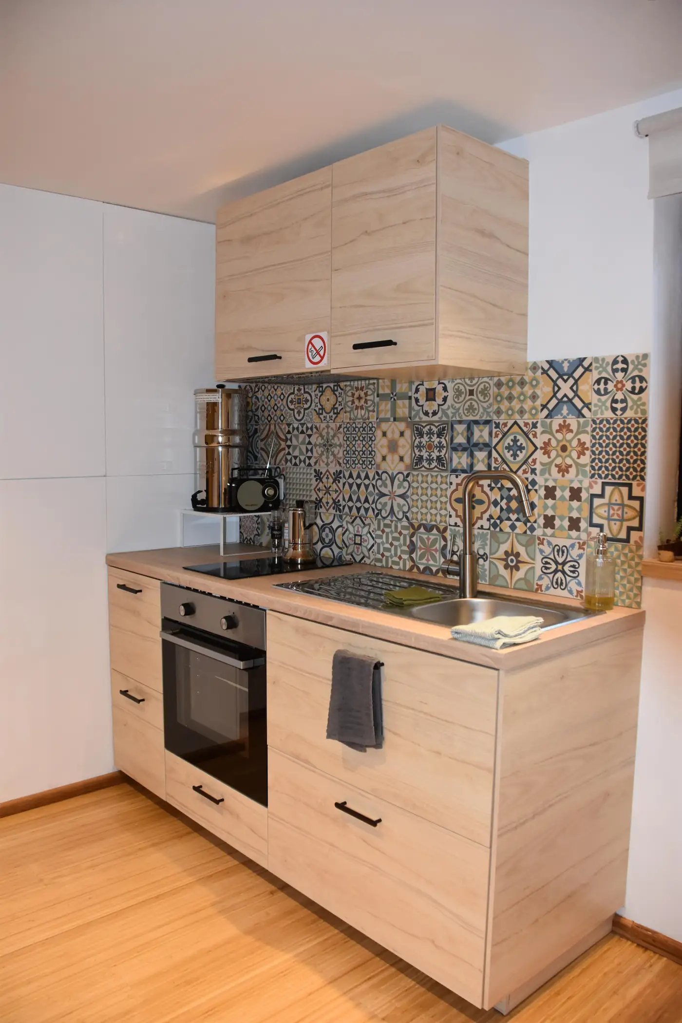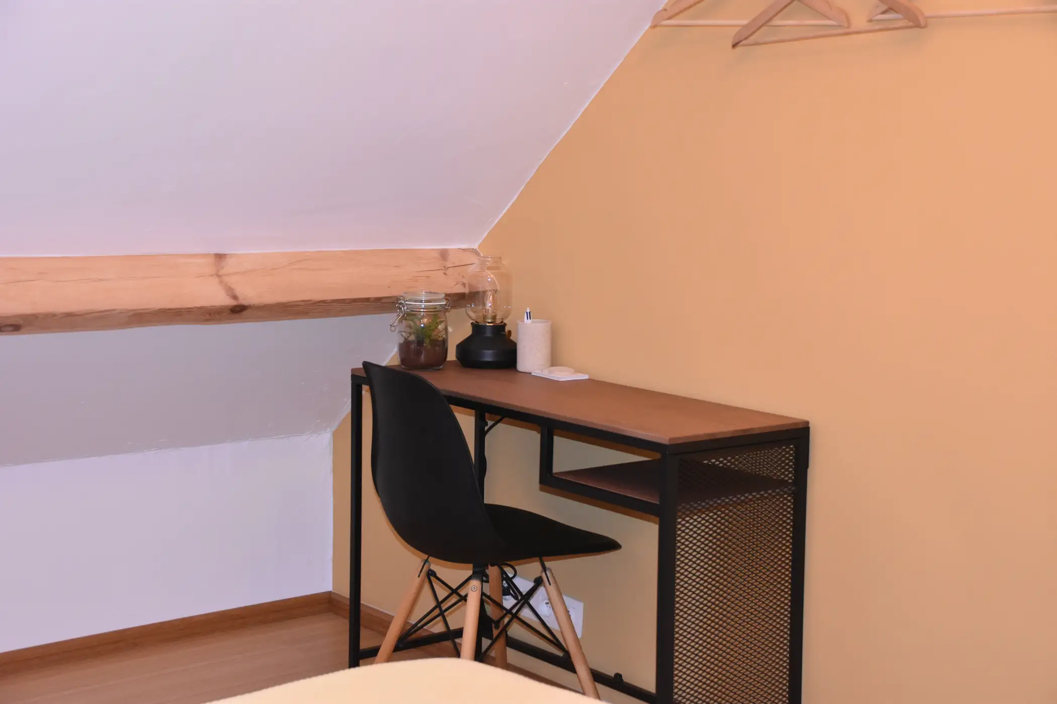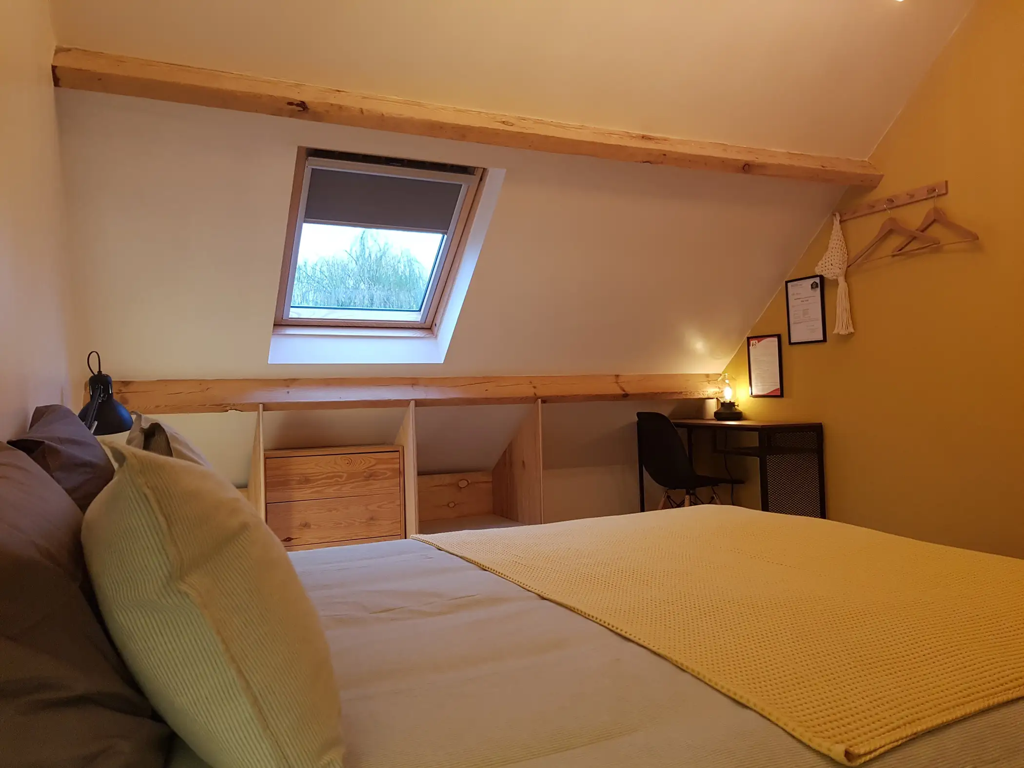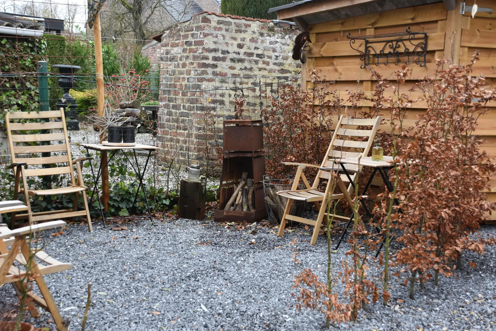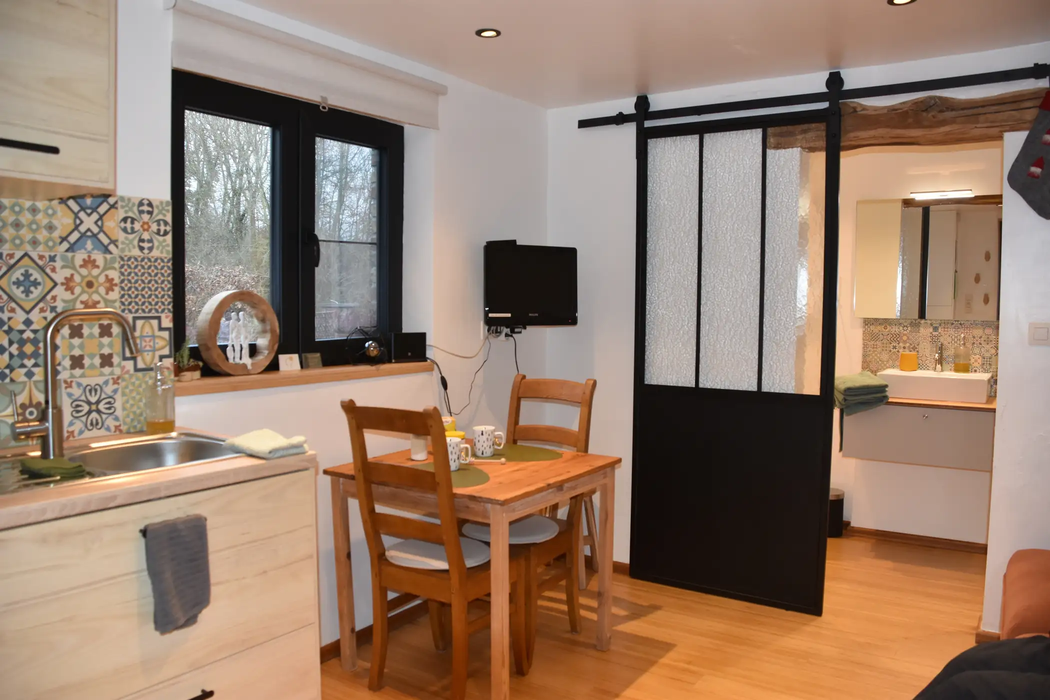De gîte heeft een eigen terras op het zuiden met een unieke vuurschaal. Een berging met 2 elektrische fietsen en andere accessoires is voorbehouden voor onze gasten. In de hoofdruimte maakt een trap met opbergruimte (koelkast, magnetron, technisch en decoratief compartiment) indruk met zijn praktische en vernieuwende invulling. Een ingerichte keuken geeft uit op de kamer voor totale gezelligheid. Uiteraard is er een klein cocooningsalon met televisie en wifi voor gezellige avonden. De meubels en accessoires hebben zowel een nuttig als een decoratief doel. Een glazen schuifdeur biedt extra privacy voor de badkamer. Een ultracompacte pellet zorgt voor warme gezelligheid. Boven is er een tweepersoonsbed en een eenvoudige maar functionele opbergruimte en een onweerstaanbaar kajuitbed op zolder met daarnaast een kleine speelruimte.