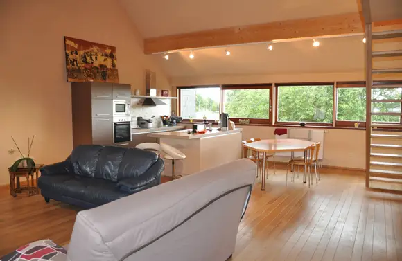 De gîte grenst aan een herenhuis, gebouwd over 2 verdiepingen, met een oppervlakte van 135 m². Gerestaureerd met natuurlijke materialen, waaronder veel hout.
