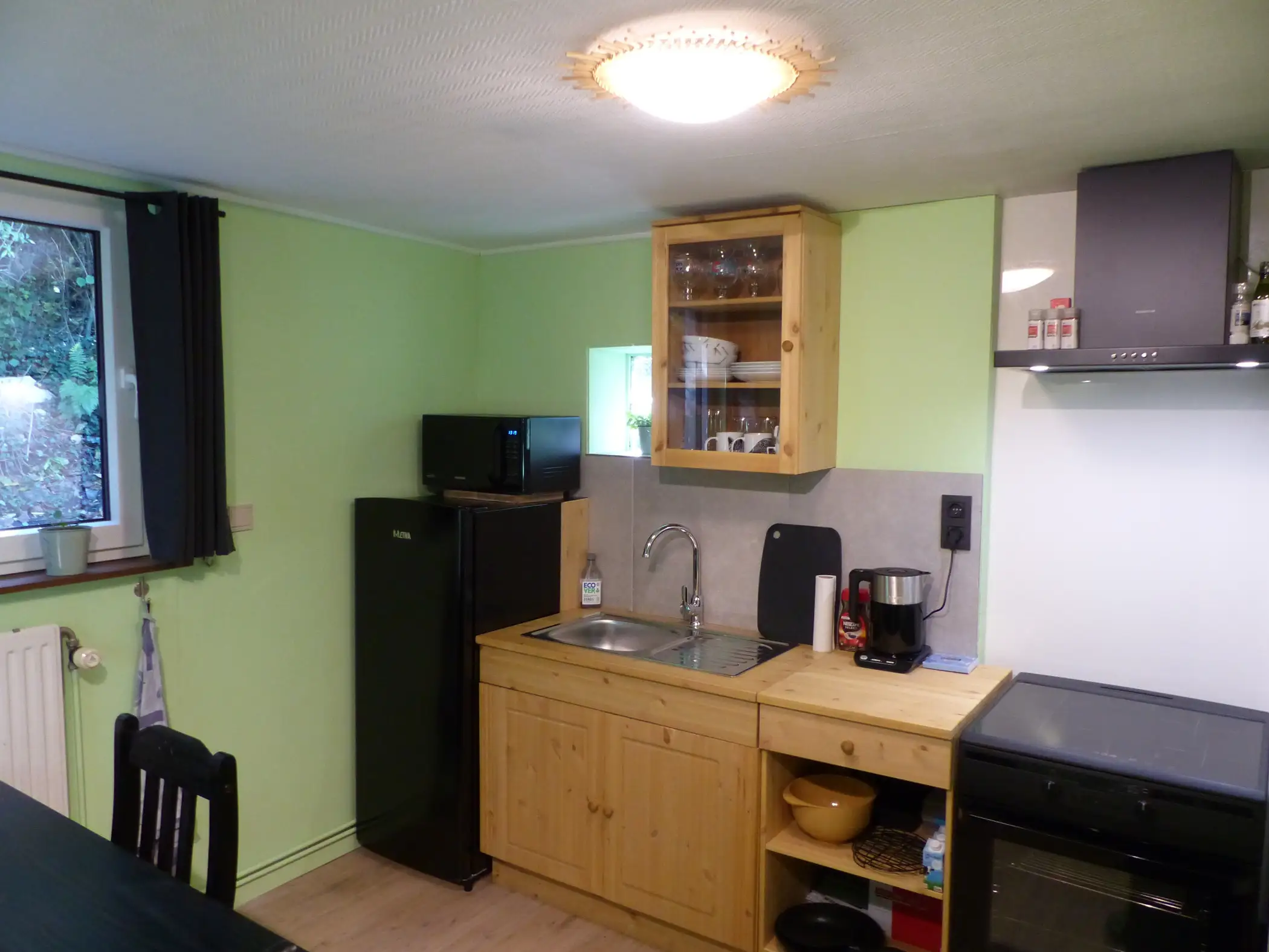 1 slaapkamer met tweepersoonsbed, ingerichte keuken, badkamer met regendouche, ruime woonkamer met pelletkachel, privétuin, BBQ, wifi.
