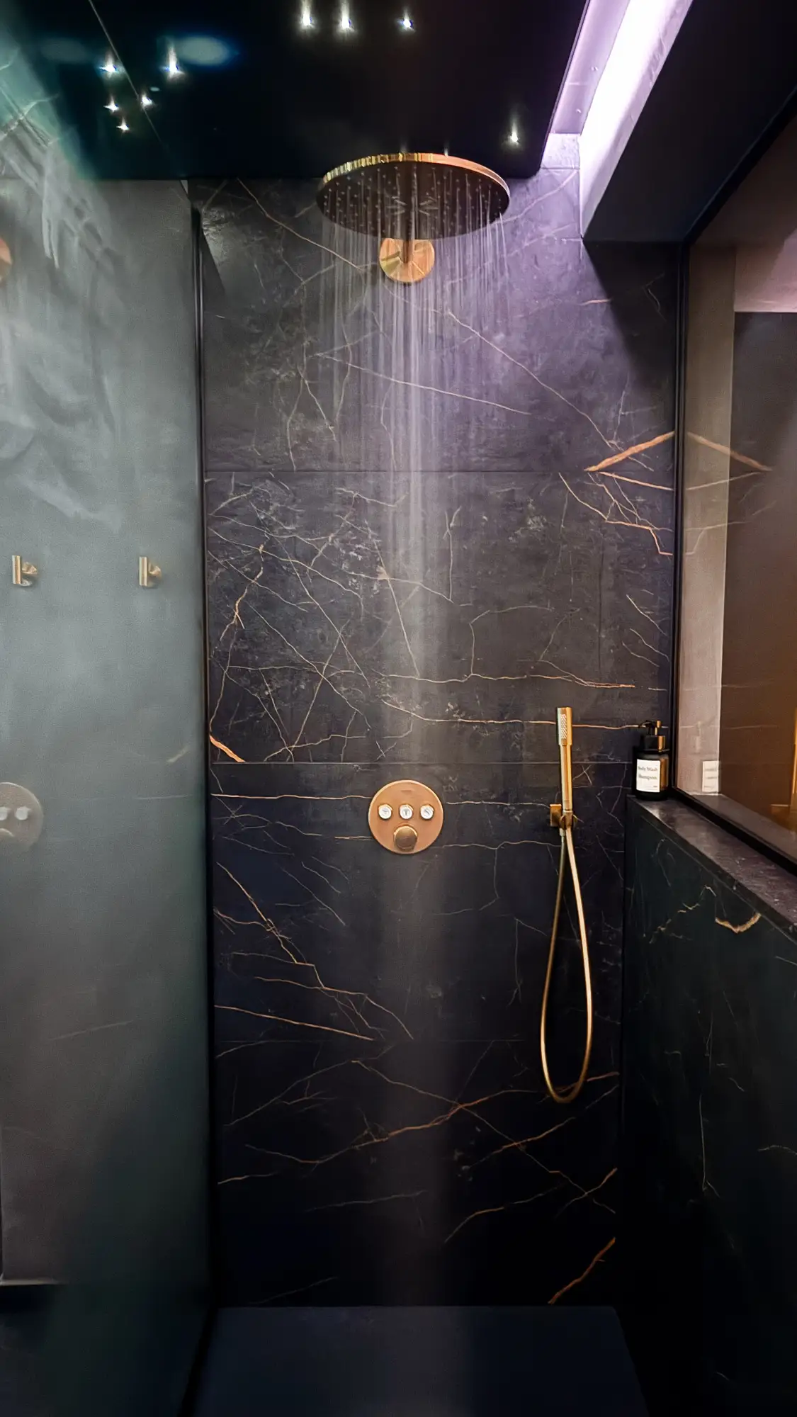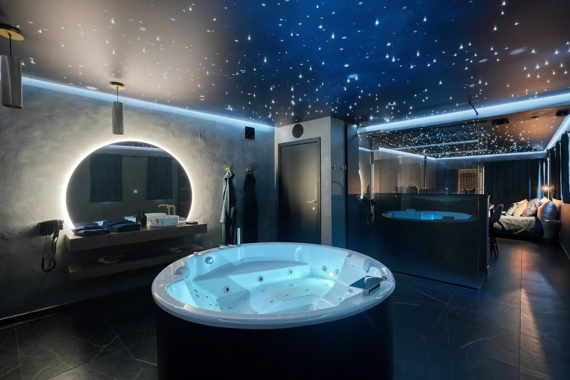Het ronde bubbelbad staat centraal in de ervaring. Ruim en comfortabel, het heeft een hydromassage-systeem met water en lucht met meerdere programma’s voor een echt ontspannend moment. De regendouche, breed en uitgerust met massagestralen, completeert de wellnessruimte.