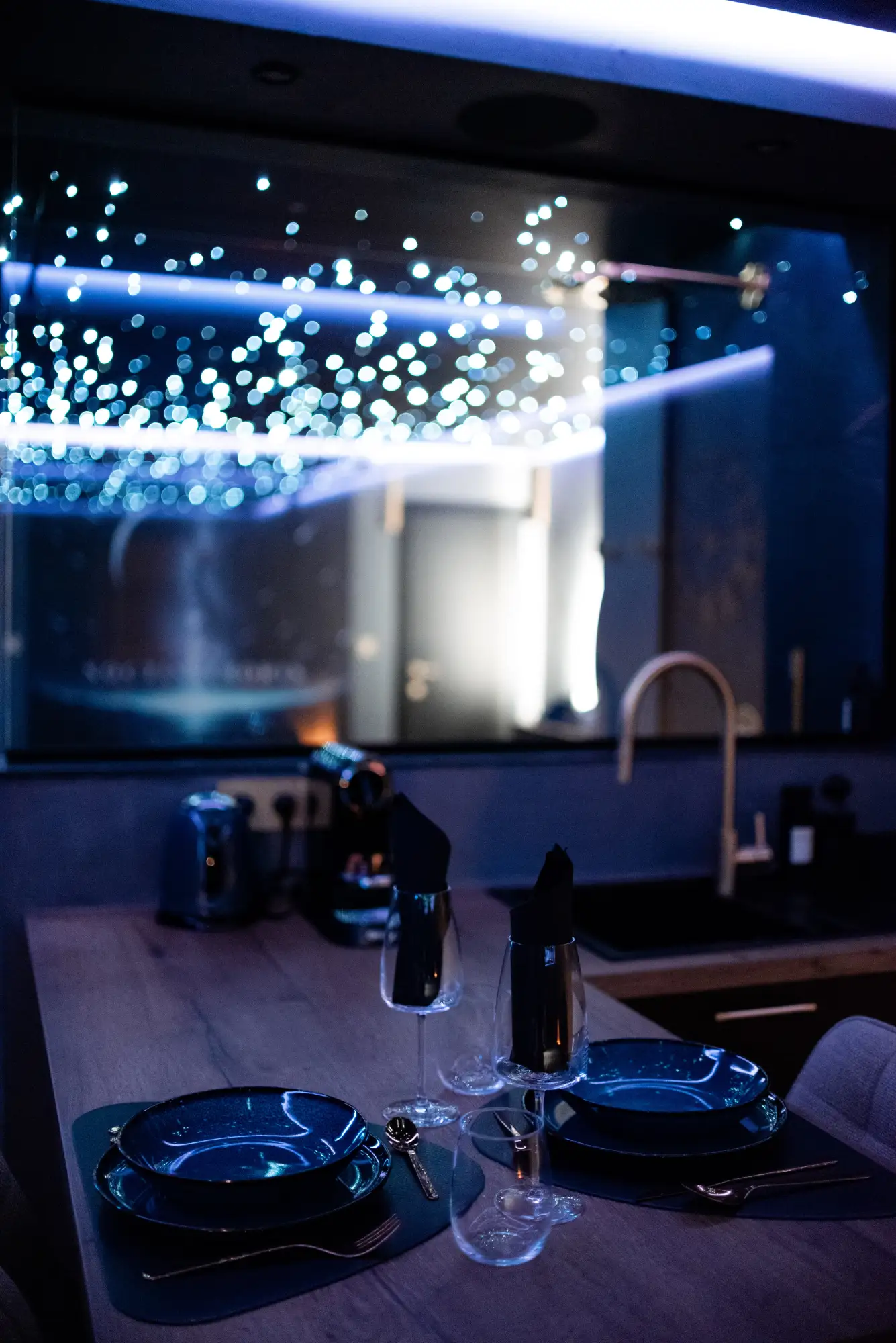 De hoofdruimte wordt gedomineerd door een sterrenplafond, dat een rustige en ontspannen sfeer creëert, zowel overdag als ‘s nachts. Het licht is zacht, de sfeer rustgevend, zonder franjes.